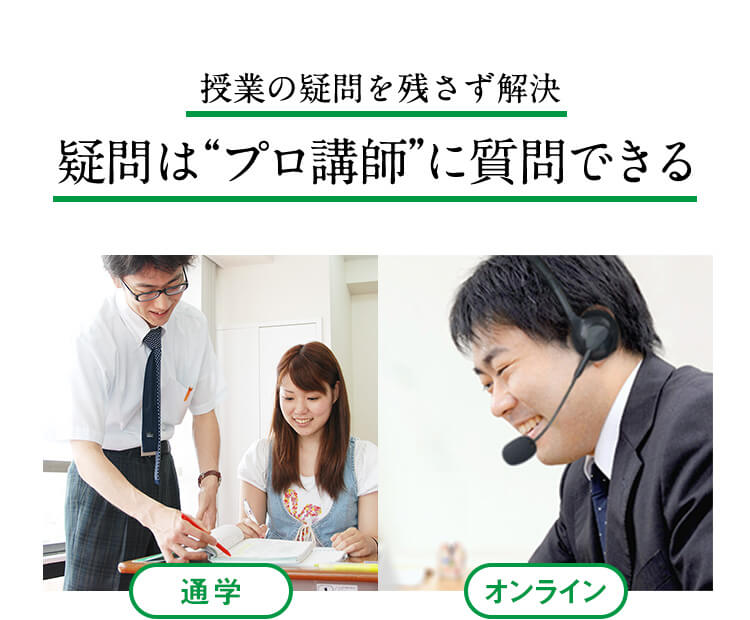 授業の疑問は「質問サポート」ですっきりと解消。オンラインの対面でプロ講師に1対1で教えてもらえます。ありがちなメールやFAXの質問制度より、断然ストレスなく勉強が進みます。