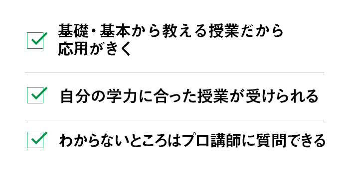 四谷学院の授業は、原理原則を基礎からわかりやすく解説することで、あなたに「そういうことだったのか!」という発見をさせ、その発見によって理解できる内容が一気に広がる授業です。