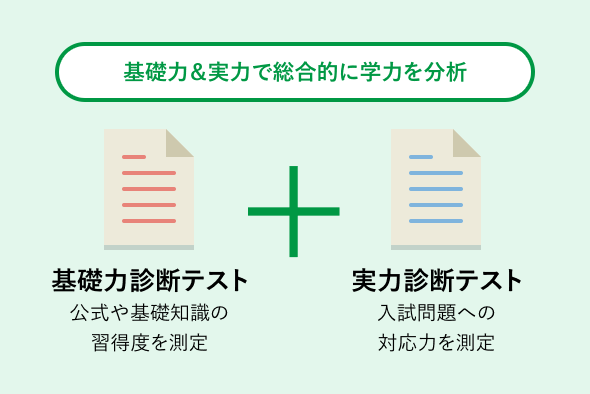 学力を大きく伸ばすためには、学力を正確に診断することが不可欠です。四谷学院では、あなたの学力を基礎力と実力の二方面から細かく分析します。