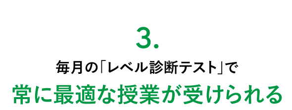 いつでも自分のレベルにぴったりの授業が受けられるよう「レベル診断テスト」を毎月実施し、上級レベルへのチャレンジが可能に。だから最後まで伸び続けられます。
