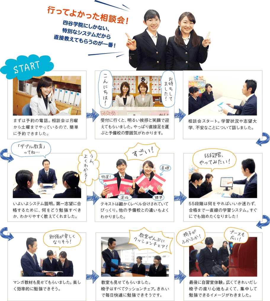 システム紹介はもちろん、受講プランの作成や教材閲覧、校舎見学などを行っています。