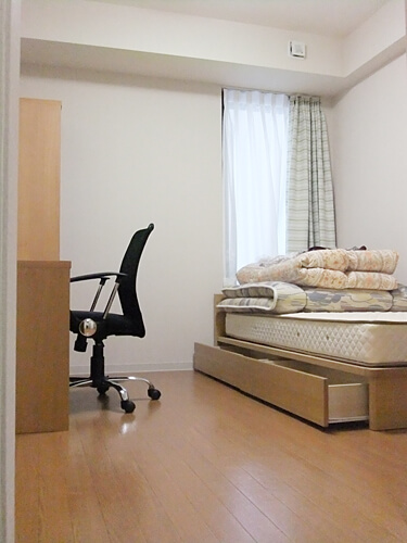 居室に洗濯機・冷蔵庫・ベッド・チェア・本棚・冷暖房などがあらかじめ用意されていますので、衣服や洗面道具などの身の回りのものと、勉強道具を持ってきてもらえれば、その日から生活がスタートできるようになっています。
