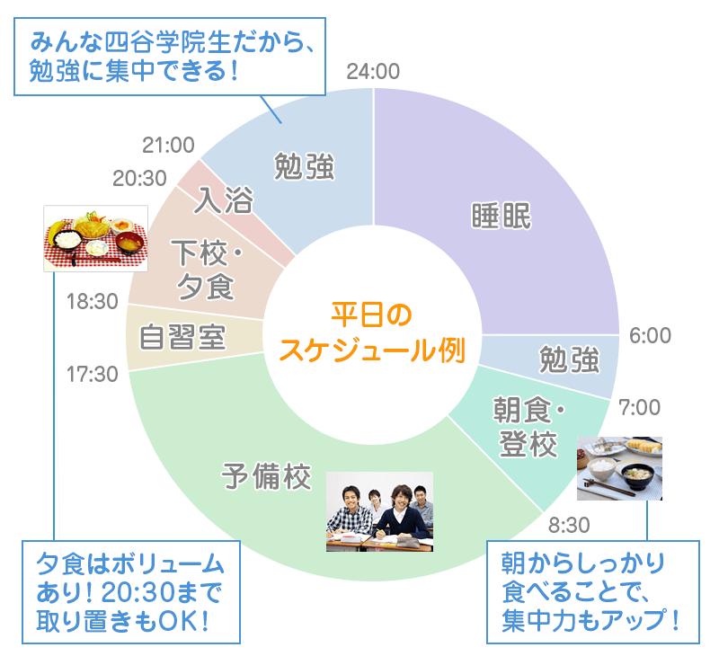 朝・夕は栄養士によって管理された美味しい食事を提供します。一人暮らしの場合、移動・買い物・調理・片付けなどで年間約1,000時間かかると言われていますが、寮なら全て勉強時間に充てられる上に、栄養バランスも満点。ごはん・味噌汁はおかわり自由です。