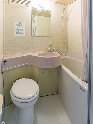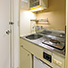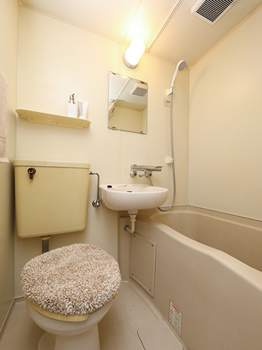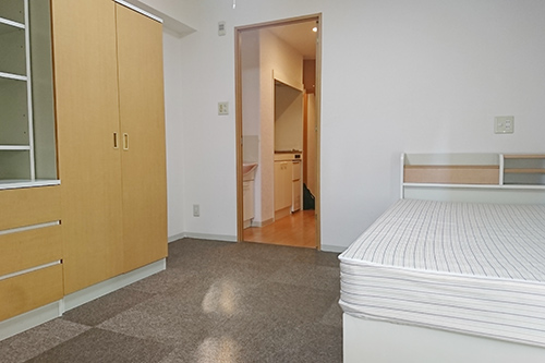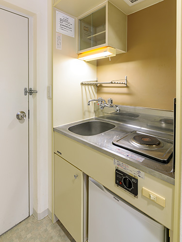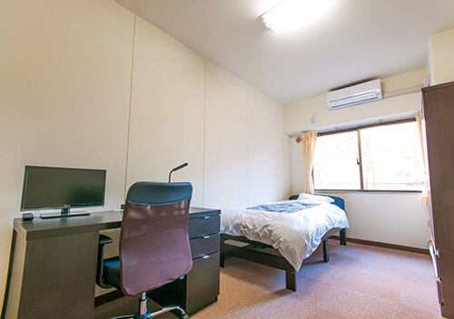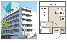| 設備等 | エアコン、ベッド、書棚、イス、クローゼット、カーテン、机、電気スタンド、照明器具、インターネット接続端子、電話、TV端子、ユニットバス、ミニキッチン |