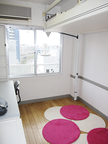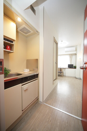 | 設備等 | 照明器具、エアコン、昇降式ベッドor置ベッド、机、イス、冷蔵庫、鏡、クローゼット、シューズ棚、オートロック式ドア、キッチン、バス、トイレ |
