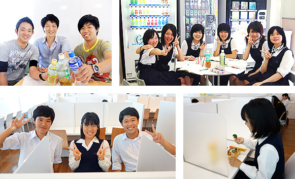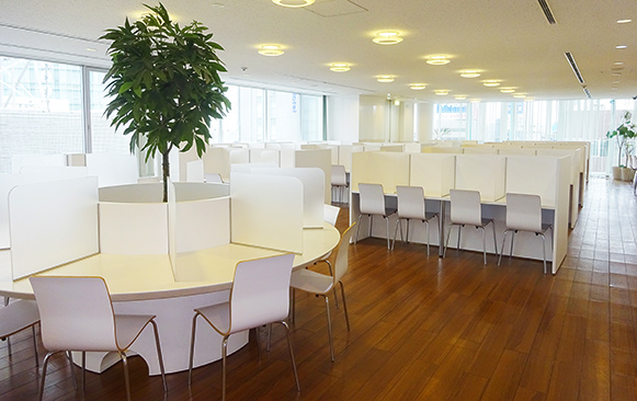 パワーみなぎる授業を受け終わって復習する前にちょっと一休みしたいとき、55段階をずっとがんばって何だか気詰まりしてきたときは、ちょっと足を運んでみましょう。机や照明も普段の教室とは違ったおしゃれな雰囲気の中で、ご飯を食べたり友達とおしゃべりしたりして気持ちをリフレッシュ。もうひとがんばりする気力がわいてきますよ。気分転換に気軽に足を運んでみよう。