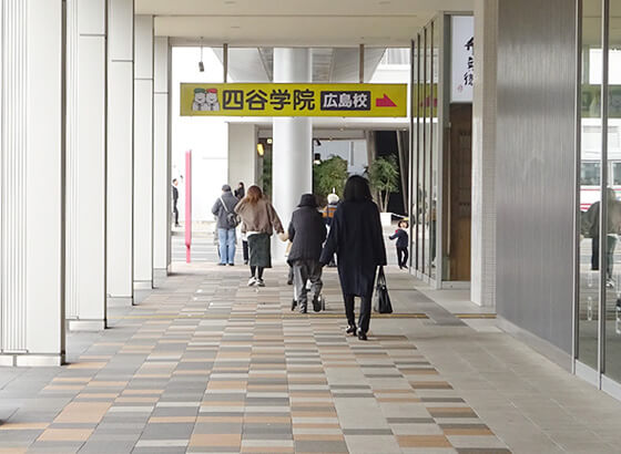 JR広島駅北口を出ると、右手に大きなビルが見えます。世界的に有名なシェラトンホテルが収容されている施設です。その施設の1、2階に大学受験予備校、四谷学院広島校があります。駅から徒歩わずか1分。大通り沿いに面した場所に校舎入口がございます。入るとすぐに受付がありますので、ご来校の方はお気軽にお声かけください。