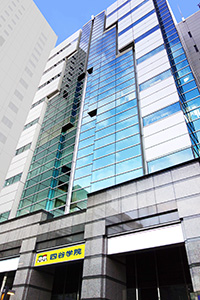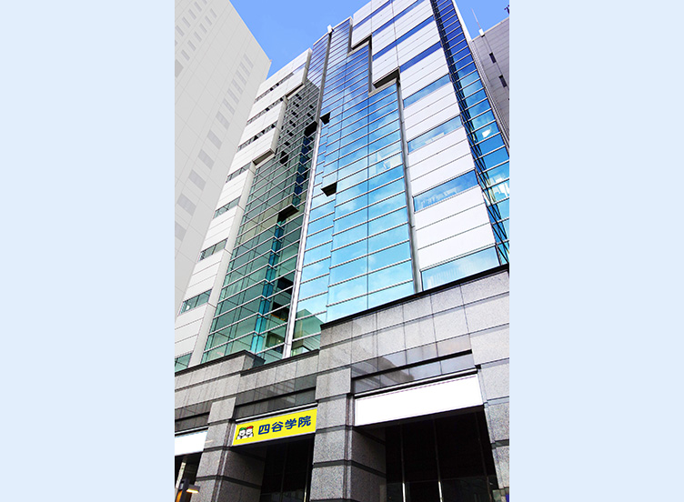 重厚感のある建物1Fに四谷学院専用の入り口を用意しています。ガラス張りで、すぐに総合受付カウンターが見えます。どうぞお気軽にお立ち寄りください。