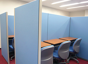 本館6階、受付のすぐ近くに完全個別指導用の授業ブースがあります。完全個別指導では、1対1、1対2の形で、苦手科目の対策、過去問対策、小論文対策、定期試験対策など、さまざまな目的に合わせて指導が受けられるようになっています。予備校コースとの併用も可能です。