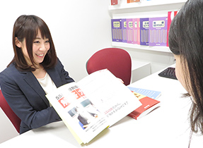 受付では明るいスタッフが元気な挨拶と笑顔で皆さんをお出迎えします。個別相談会に参加される場合や資料だけもらいたいという場合も、まずは受付までお越しください。A館の受付では各種申込や自習室の貸し出しなども行っています。わからないことがあればいつでもスタッフに相談してくださいね。