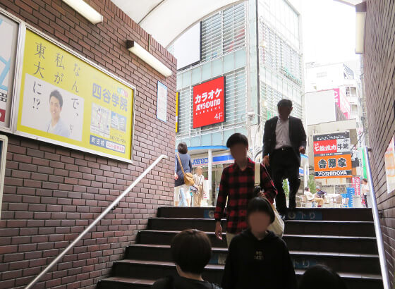 線路と逆方向、りそな銀行側50メートル先に四谷学院の看板が見えます。