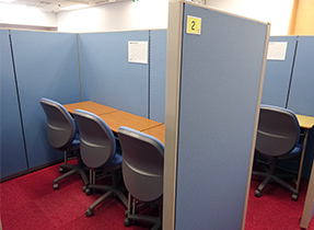 完全個別指導のブースです。ここで、苦手科目の克服、大学受験のための傾向対策、学校のサポートなど、各自の希望に応じて、先生がたっぷり時間をかけて指導してくれます。1:1と1:2の形式を選ぶことができます。予備校コースと併用して受講することもできます。