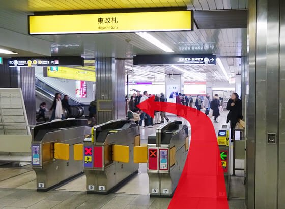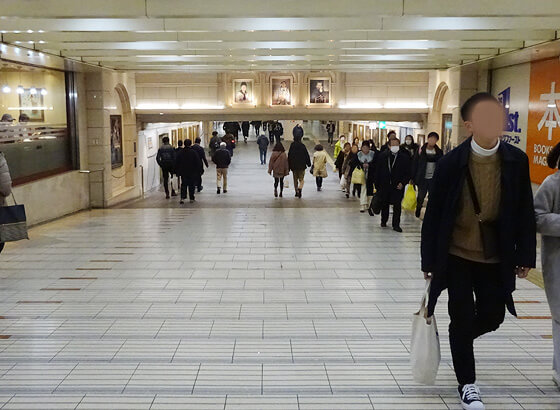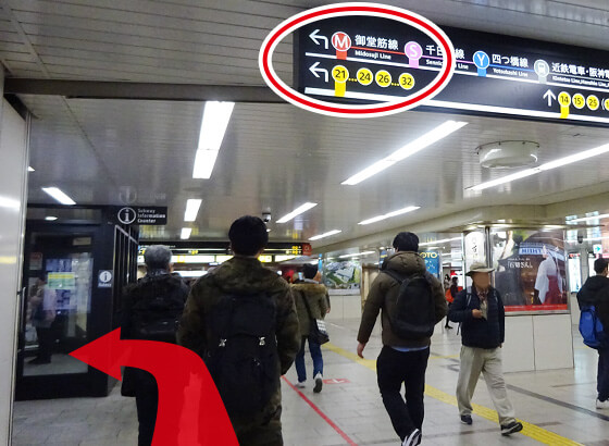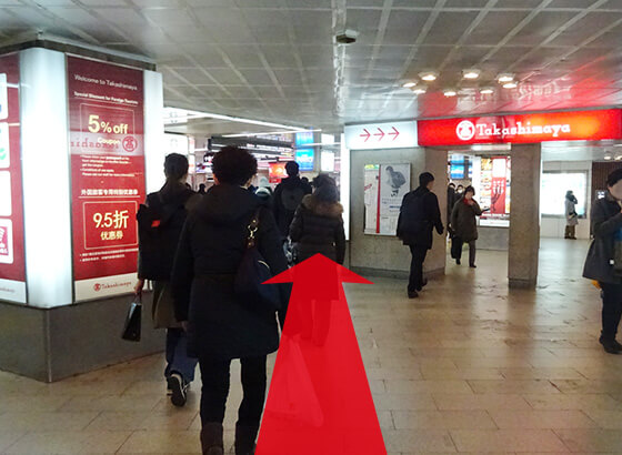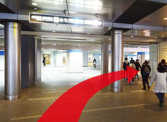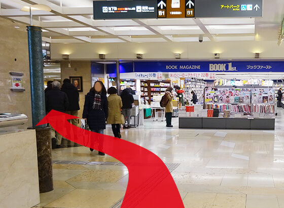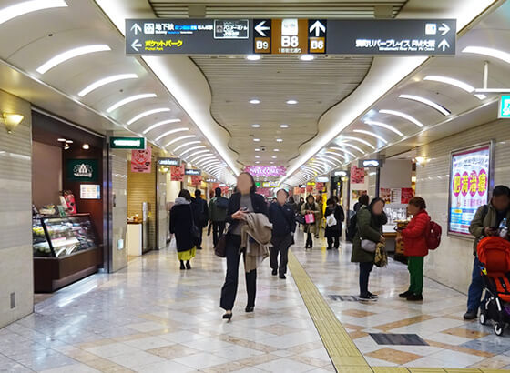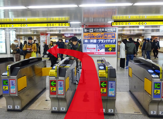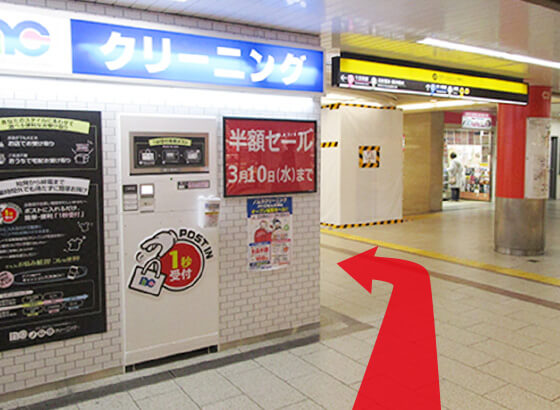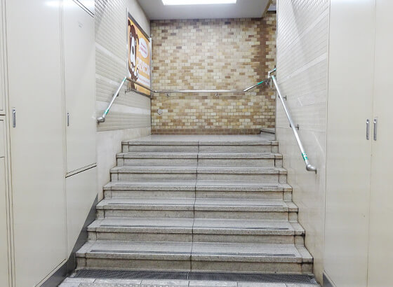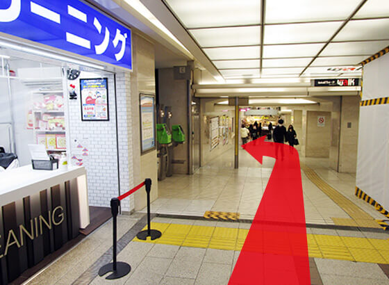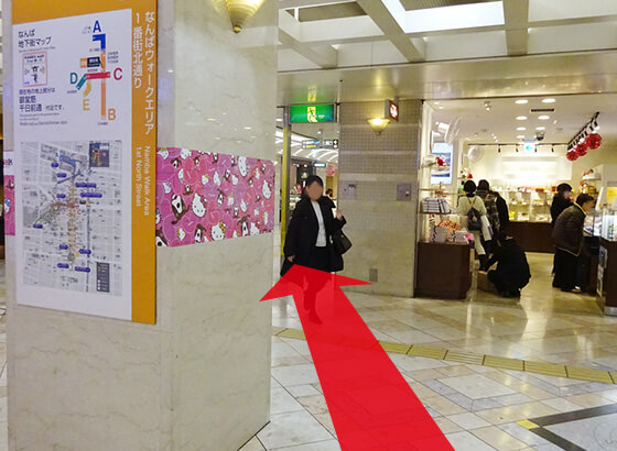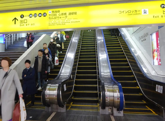 改札を出て真っすぐ進み駅構内を出て、左手にポンテ広場を見て地下にお進み下さい。階段を下りて右方向に進みますと「いか太閤」「串かつ」というお店が見え通路が2手に分かれます。左側の通路へ進みますと、左手に「CAFE DE CLEVER」が見えますので、そのすぐ手前のなんばウォークB6出口より地上にお上がり下さい。右側すぐに難波御堂筋ウエストがございます。