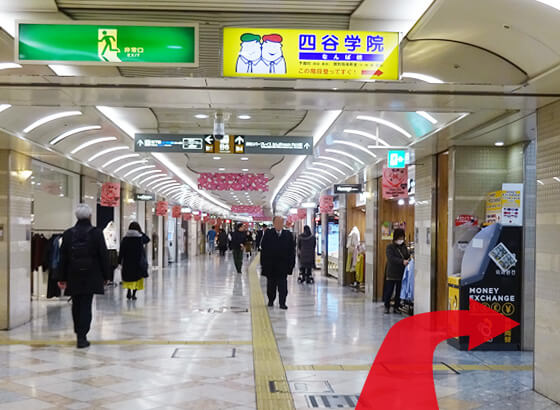 大学受験予備校、四谷学院なんば校は難波の中心街にあります。建物の目の前になんばウォーク(地下街)の出入口があり、地下鉄・南海・近鉄・JRの各駅とつながっていますので、天候が悪い日も通塾に便利です。受付は1階にありますので、相談会に参加される方はまずこちらの受付までお越しください。