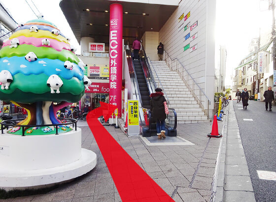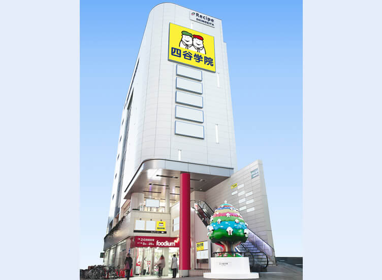 小田急線東口改札から右手前に折り返すようにお進みください。井の頭線の高架下まで進みますと、工事中フェンスの前方上に四谷学院の入るRecipe SHIMOKITAのビルが見えます。ビル1Fスーパー右側のエレベーターで8階までお越しください(エスカレーターでは行けません)。