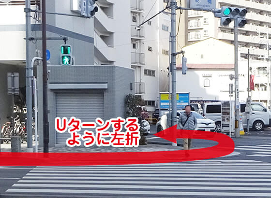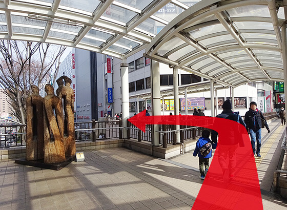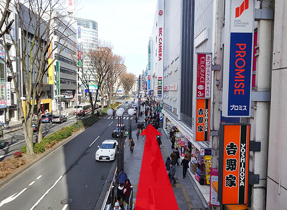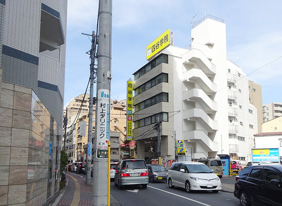 立川駅北口を出て、ビックカメラのある通りをまっすぐ歩いていくと、正面にローソンが見える交差点にあたります。交差点を渡って右に曲がり、キンコーズを左手に通過して最初の曲がり角を左折すると、前方右手に四谷学院があります。