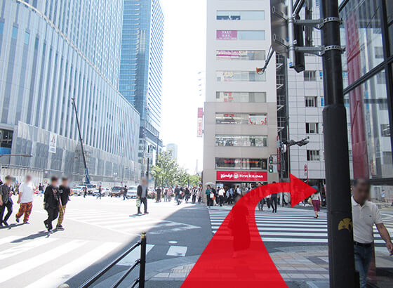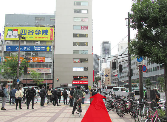茶屋町口改札口より阪急三番街を抜け、芝田1丁目交差点をジャンカラ(カラオケ店)からウェンディーズファーストキッチンの方へお渡りください。右に曲がり大通り沿いに進みますと、黄色の看板が目印の四谷学院梅田校がございます。