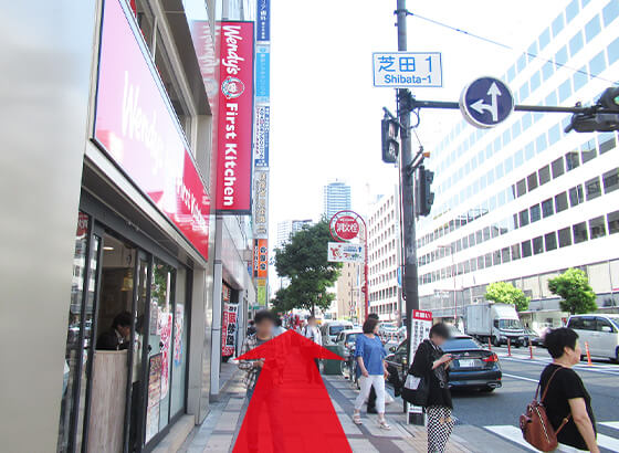 大阪駅御堂筋北口よりヨドバシカメラ前、芝田1丁目交差点に出ていただきますとウェンディーズファーストキッチンがございます。そのまま大通り沿いに進みますと、黄色の看板が目印の四谷学院梅田校がございます。