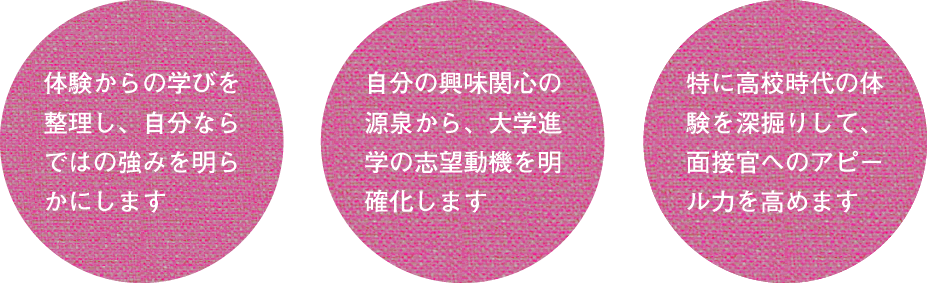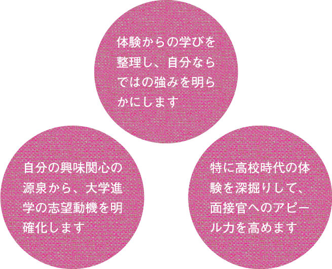 志望理由書・自己推薦文等の添削は本講座の内容に含まれていませんが、本講座で学ぶことは、出願書類作成にあたっても十分有用なものです。出願書類等の添削チェックをご希望の場合は、別途、完全個別指導をお申込みください。プロ講師が1対1で添削指導を行います。詳細はお問い合わせください。
