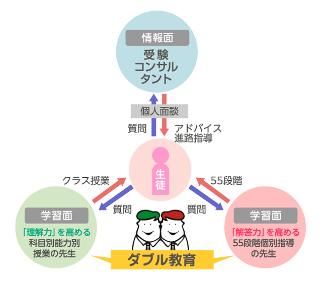 受験勉強には学習指導の先生と、受験生活の悩み・不安を一緒になって解決してくれる進路指導の先生が不可欠です。四谷学院では、いつでも親身になって相談にのり時には厳しく指導してくれる受験コンサルタントと、学習面を担当する2タイプの先生が、3方向からがっちりとサポートしてくれます。あなたの受験勉強を支える心強い味方。このトライアングルサポートシステムで、あなたも「まさかの伸び」を体験しましょう。