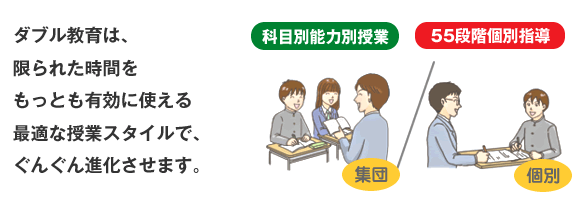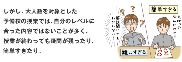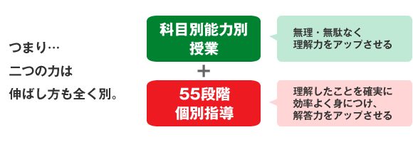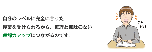 ギャップが生まれやすい志望大学別や教科別得点によるクラス編成とは異なり、科目別にあなたの学力に合った授業が受けられます。
