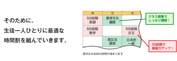 「55段階」は受験に必要な知識やテクニックを、段階を追って無駄なく学びやすい順序に並び替えたものです。部分部分を完成させていくことによって全体を完成させていきます。しかも、中1レベルからスタートするのに、最後は東大レベルまで到達。本質を理解させて学力を上げていくシステムです。