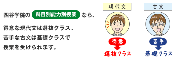 四谷学院のクラス授業は「科目」ごとにレベルチェックした上でクラス編成しています。