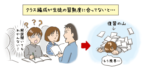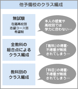 「英語は得意だけど数学は苦手」「数学ⅠAⅡBはやったことがあるけど、数Ⅲははじめて勉強する」「現代文は得意だけど古文は全然ダメ」など、誰でも科目間の学力差を持っているのが普通です。志望コースや総合点・教科ごとの得点でクラスが決まる予備校では、科目によって簡単すぎたり難しすぎたり、自分の学力とのギャップが生じ、学力は伸びません。