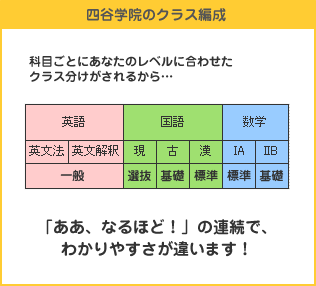四谷学院では、「科目」ごとにあなたのレベルに合わせたクラス分けをしています。国語でも、「現代文は苦手だから基礎クラス、古文は得意だから選抜クラス」のようにきめ細かくクラス分けされるので、安心して授業が受けられます。