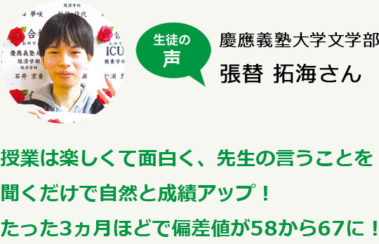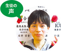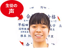 - 先生方は生徒のつまずきやすいポイントを熟知しており、私が完全に理解するまでとことん教えてくれました。偏差値30台をとった数学も先生方の熱く優しい指導のおかげで克服できました!