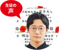 - 浪人するにあたり、現役のときは受験に使わなかった世界史を1から始めなければならない状況でしたが、四谷学院の授業は楽しくて面白く、大学でも専攻したいと思うくらい歴史が好きになりました。先生は、面白さの中にも生徒思いの厳しさがある方で、先生の言うことを聞くだけで成績は自然と上がっていきました。たったの3ヵ月ほどで偏差値が58から67へと10近く上がりましたが、何か特別なことをした訳ではなく、毎回の授業の予習と復習、小テストをこなしていただけです。