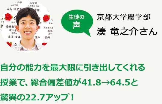 - 高3時の判定はDE、本番も合格まで100点不足でした。55段階で基礎を作りながら授業で応用問題に取り組み、京大模試B~Aに。本番も実力を出し切り第一志望学科に合格しました。