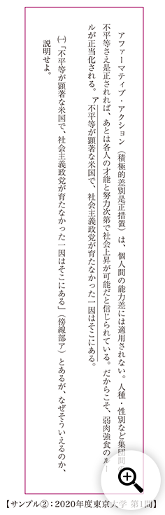 サンプル②は東大の2020年の第1問ですが、傍線部内に「そこ」という指示語があることに気がつきますね。したがって、共通テストと同じく、直前の内容を正確に理解することで、「弱肉強食のルールが正当化される」米国では、「個人間の能力差」は「各人の才能と努力次第で社会上昇が可能だと信じられている」から…、という解答の大枠をつかむことが可能になります(解答例:「機会均等に基づく自由競争が容認される米国では、勝敗の原因は各人の能力不足に帰せられ、改革による格差改善の意識は共有されにくいから。」)