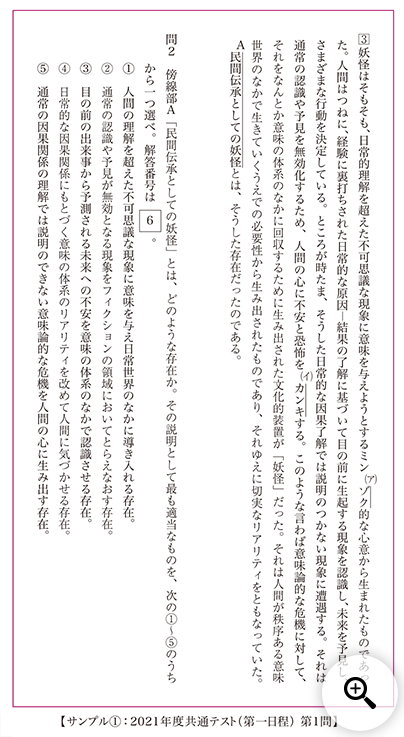 例えば、上記サンプル①は2021年の共通テスト(第一日程)の第1問ですが、傍線部の直後に「そうした」という指示語があるため、この場合は直前の内容を正確に理解すればよいことがわかります(正解は①)。