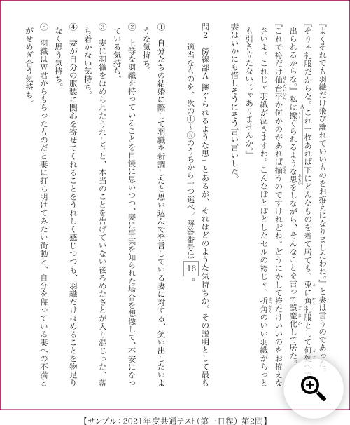 上記のサンプルは、やはり主人公の心情を(比喩的に)表現した箇所に傍線が引かれており、その内容が問われています。ここでは主人公が「擽くすぐられるような思おもい」をする直接的な理由は、妻のセリフ(「飛び離れていいものを…」)にあります。そしてまた、そうした妻への返答の仕方(「…誤